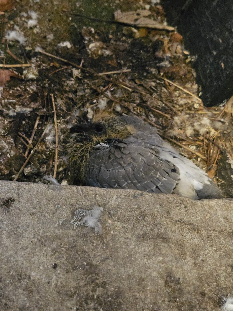 Today was the first day I saw all three of them hanging out together, since the egg was laid there’s only been one of the parents taking care of it. It took us way too long to realize that the parents were taking turns on the egg. Every other day the pigeon on the egg would be really skittish and waddle away from it when we opened the door. It turns out one of the parents is a coward and the other is not. There will be a morning soon when we open the door and the little nest will be empty.